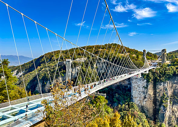 Zhangjiajie enables travelers to try exciting programs while enjoying the scenery. For example, test your courage on the 300-meter-high (985 feet) transparent glass bridge, climb the almost vertical steel cables built by cliff, and walk 999 staircases that almost exhaust your strength.